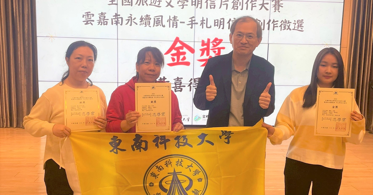東南科技大學休閒事業管理系學生吳建紅、葉寶玉、張滿萍與指導老師王堅楚合影,展現團隊攜手以創意詮釋永續理念,榮獲佳績實至名歸。東南科技大學休閒事業管理系在「2025全國旅遊文學明信片創作大賽…東南科技大學休閒事業管理系學生吳建紅、葉寶玉、張滿萍與指導老師王堅楚合影,展現團隊攜手以創意詮釋永續理念,榮獲佳績實至名歸。東南科技大學休閒事業管理系在「2025全國旅遊文學明信片創作大賽…東南科技大學休閒事業管理系學生吳建紅、葉寶玉、張滿萍與指導老師王堅楚合影,展現團隊攜手以創意詮釋永續理念,榮獲佳績實至名歸。東南科技大學休閒事業管理系在「2025全國旅遊文學明信片創作大賽…